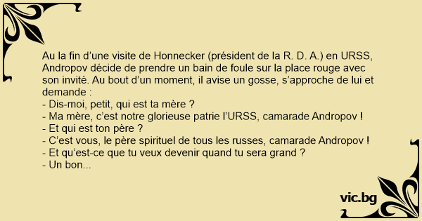 Au la fin d’une visite de Honnecker (président de la R. D. A.) en URSS, Andropov décide de prendre un bain de foule sur la place rouge avec son invité. Au bout d’un moment, il avise un gosse, s’approche de lui et demande :
