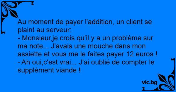 - Monsieur,je crois qu'il y a un problème sur ma note... J'avais une mouche dans mon assiette et vous me le faites payer 12 euros !