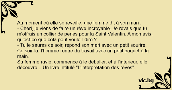 - Chéri, je viens de faire un rêve incroyable. Je rêvais que tu m'offrais un collier de perles pour la Sаinт Valentin. A mon avis, qu'est-ce que cela peut vouloir dire ?