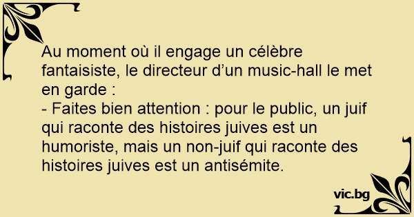 - Faites bien attention : pour le public, un juif qui raconte des histoires juives est un humoriste, mais un non-juif qui raconte des histoires juives est un antisémite.