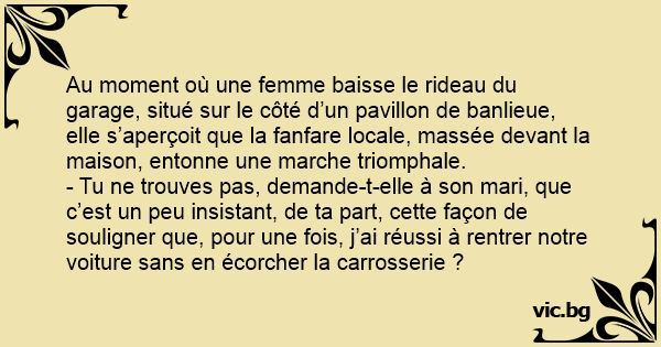 - Tu ne trouves pas, demande-t-elle à son mari, que c’est un peu insistant, de ta part, cette façon de souligner que, pour une fois, j’ai réussi à rentrer notre voiture sans en écorcher la carrosserie ?