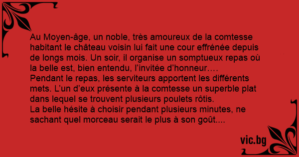 Au Moyen-âge, un noble, très amoureux de la comtesse habitant le château voisin lui fait une cour effrénée depuis de longs mois. Un soir, il organise un somptueux repas où la belle est, bien entendu, l’invitée d’honneur….