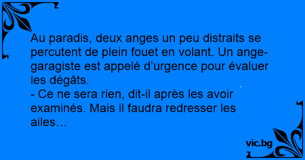 Au paradis, deux anges un peu distraits se percutent de plein fouet en volant. Un ange-garagiste est appelé d’urgence pour évaluer les dégâts.