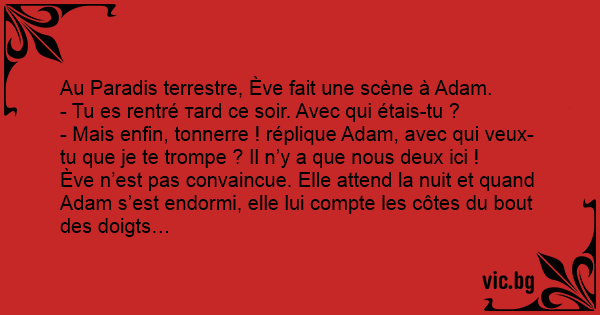 - Mais enfin, tonnerre ! réplique Adam, avec qui veux-tu que je te trompe ? Il n’y a que nous deux ici !