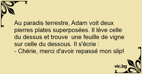 Au paradis terrestre, Adam voit deux pierres plates superposées. Il lève celle du dessus et trouve une feuille de vigne sur celle du dessous. Il s'écrie :