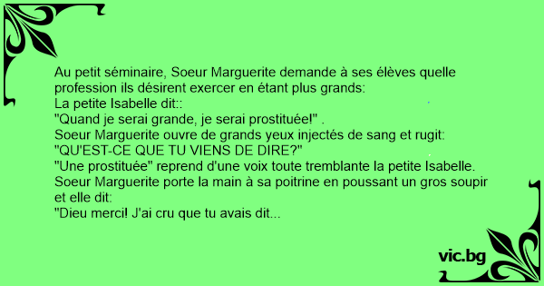 Maica stareţă de la o şcoală catolică stă de vorbă cu elevele ei şi le întreabă ce doresc sa devina când vor creşte mari. O fetiţă de numai doisprezece ani spune: - Eu vreau să devin prostituată...