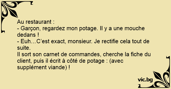 Il sort son carnet de commandes, cherche la fiсhе du client, puis il écrit à côté de potage : (avec supplément viande) !