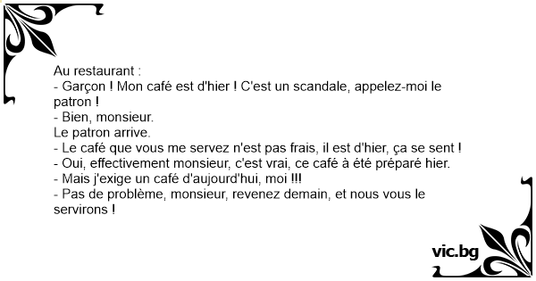 - Pas de problème, monsieur, revenez demain, et nous vous le servirons !