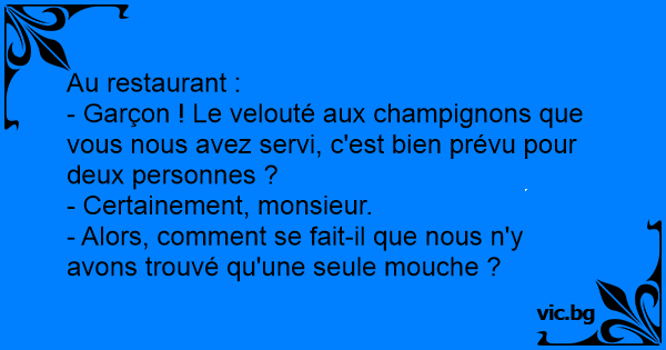 - Garçon ! Le velouté aux champignons que vous nous avez servi, c'est bien prévu pour deux personnes ?