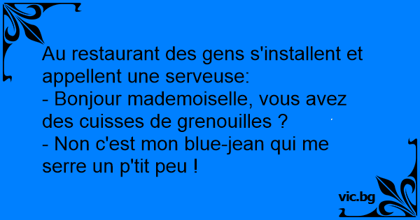 - Garçon ! Vous avez des cuisses de grenouilles ? - Non monsieur, c'est mon pantalon qui me serre trop.