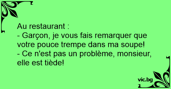 - Garçon, je vous fais remarquer que votre pouce trempe dans ma soupe!