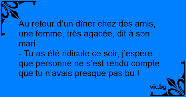 Au retour d’un dîner chez des amis, une femme, très agacée, dit à son mari :