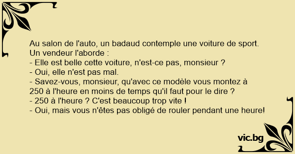 - Savez-vous, monsieur, qu'avec ce modèle vous montez à 250 à l'heure en moins de temps qu'il faut pour le dire ?
