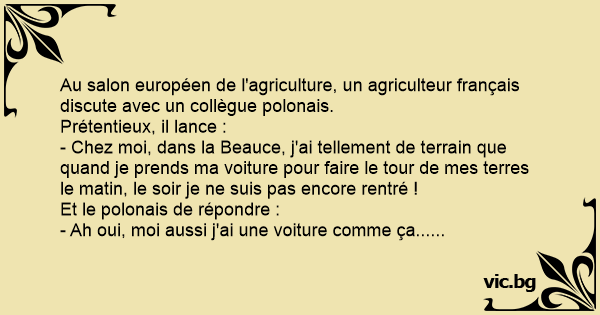 - Chez moi, dans la Beauce, j'ai tellement de terrain que quand je prends ma voiture pour faire le tour de mes terres le matin, le soir je ne suis pas encore rentré !