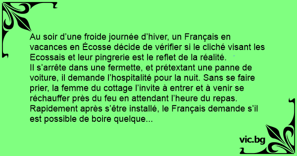 Au soir d’une froide journée d’hiver, un Français en vacances en Écosse décide de vérifier si le cliché visant les Ecossais et leur pingrerie est le reflet de la réalité.