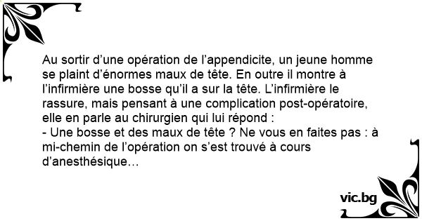 Au sortir d’une opération de l’appendicite, un jeune homme se plaint d’énormes maux de tête. En outre il montre à l’infirmière une bosse qu’il a sur la tête. L’infirmière le rassure, mais pensant à une complication post-opératoire, elle en parle au chirurgien qui lui répond :