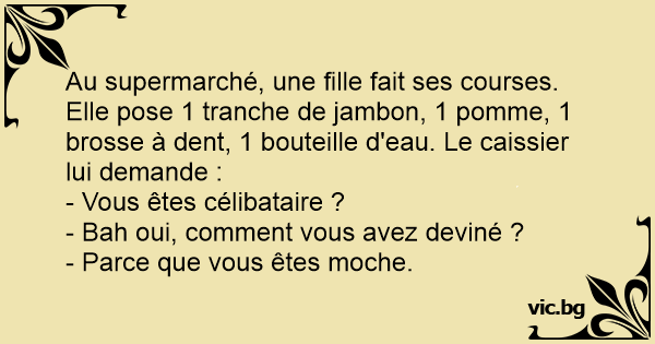 Au supermarché, une fille fait ses courses. Elle pose 1 tranche de jambon, 1 pomme, 1 brosse à dent, 1 bouteille d'eau. Le caissier lui demande :
