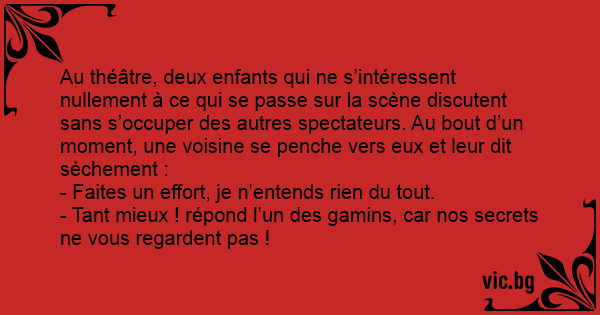 Au théâtre, deux enfants qui ne s’intéressent nullement à ce qui se passe sur la scène discutent sans s’occuper des autres spectateurs. Au bout d’un moment, une voisine se penche vers eux et leur dit sèchement :
