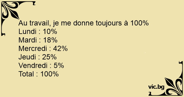 Au travail, je me donne toujours à 100%<br />Lundi : 10%<br />Mardi : 18%<br />Mercredi : 42%<br />Jeudi : 25%<br />Vendredi : 5%<br />Total : 100%