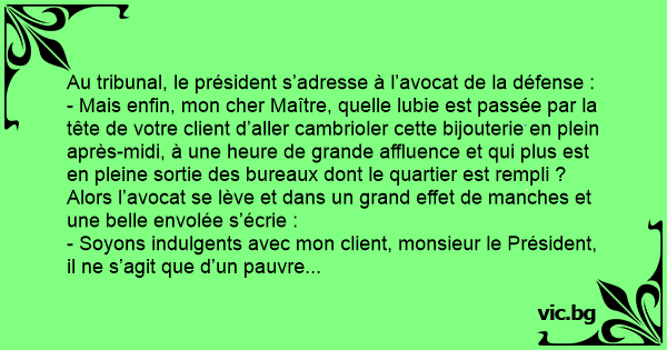 - Mais enfin, mon cher Maître, quelle lubie est passée par la tête de votre client d’aller cambrioler cette bijouterie en plein après-midi, à une heure de grande affluence et qui plus est en pleine sortie des bureaux dont le quartier est rempli ?