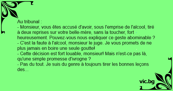 - C'est la faute à l'alcool, monsieur le juge. Je vous promets de ne plus jamais en boire une seule goutte!