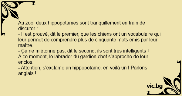 - Attention, s’exclame un hippopotame, en voilà un ! Parlons anglais !