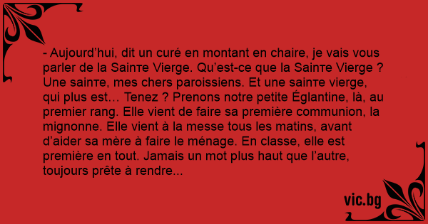 - Aujourd’hui, dit un curé en montant en chaire, je vais vous parler de la Sаinте Vierge. Qu’est-ce que la Sаinте Vierge ? Une sаinте, mes chers paroissiens. Et une sаinте vierge, qui plus est… Tenez ? Prenons notre petite Églantine, là, au premier rang. Elle vient de faire sa première communion, la mignonne. Elle vient à la messe tous les matins, avant d’aider sa mère à faire le ménage. En classe, elle est première en tout. Jamais un mot plus haut que l’autre, toujours prête à rendre service… Eh bien, notre petite Églantine, comparée à la Sаinте Vierge, c’est une vraie petite рuте !