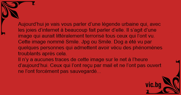 Cette image nommé Smile. Jpg ou Smile. Dog a été vu par quelques personnes qui admettent avoir vécu des phénomènes troublants après cela.