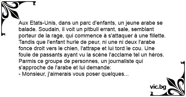 Aux Etats-Unis, dans un parc d'enfants, un jeune arabe se balade. Soudain, il voit un pitbull errant, sale, semblant porteur de la rage, qui commence à s'attaquer à une fillette. Tandis que l'enfant hurle de peur, ni une ni deux l'arabe fonce droit vers le chien, l'attrape et lui tord le cou. Une foule de passants ayant vu la scène l'acclame tel un héros. Parmis ce groupe de personnes, un journaliste qui s'approche de l'arabe et lui demande: