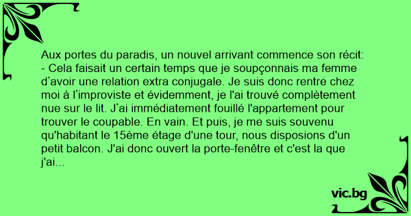 - Cela faisait un certain temps que je soupçonnais ma femme davoir une relation extra conjugale. Je suis donc rentre chez moi à limproviste et évidemment, je l'ai trouvé complètement nue sur le lit. Jai immédiatement fouillé l'appartement pour trouver le coupable. En vain. Et puis, je me suis souvenu qu'habitant le 15ème étage d'une tour, nous disposions d'un petit balcon. J'ai donc ouvert la porte-fenêtre et c'est la que j'ai vu cet homme suspendu dans le vide et s'agrippant à la rambarde du balcon. Je lui ai piétiné les mains pour qu'il tombe, mais il tenait bon. Alors je suis parti chercher un marteau. A grands coups sur chaque main, il a fini par lâcher prise. Mais un arbre a amorti sa chute. Voyant qu 'il bougeait encore, j'ai attrapé le réfrigérateur de la cuisine et je l'ai fait basculer sur cet individu. L 'effort a été si violent que j'ai succombé à une crise cardiaque. Et donc me voilà.