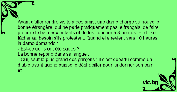 Avant d'aller rendre visite à des amis, une dame charge sa nouvelle воnnе étrangère, qui ne parle pratiquement pas le français, de faire prendre le bain aux enfants et de les coucher à 8 heures. Et de se fâcher au besoin s'ils protestent. Quand elle revient vers 10 heures, la dame demande :