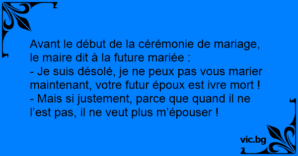 Avant le début de la cérémonie de mariage, le maire dit à la future mariée : - Je suis désolé, je ne peux pas vous marier maintenant, votre futur époux est ivre mort ! - Mais si justement, parce que quand il ne l’est pas, il ne veut plus m’épouser !