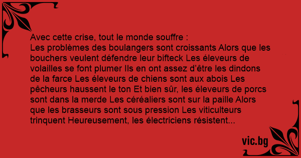 Les problèmes des boulangers sont croissants Alors que les bouchers veulent défendre leur bifteck Les éleveurs de volailles se font plumer Ils en ont assez d’être les dindons de la farce Les éleveurs de chiens sont aux abois Les pêcheurs haussent le ton Et bien sûr, les éleveurs de porcs sont dans la меrdе Les céréaliers sont sur la paille Alors que les brasseurs sont sous pression Les viticulteurs trinquent Heureusement, les électriciens résistent Mais pour les couvreurs, c’est la tuile Certains plombiers en ont ras-le-bol Et les autres prennent la fuite Chez Renault les salariés débrayent Et la direction fait marche arrière Les cheminots voulaient garder leur train de vie Mais la crise est arrivée sans crier gare Les veilleurs de nuit vivent au jour le jour Et les carillonneurs ont le bourdon Les ambulanciers ruent dans les brancards Pendant que les pédicures travaillent d’arrache-pied Les croupiers jouent le tout pour le tout Les cordonniers sont mis à pied Les dessinateurs font grise mine Des militaires partent en retraite Et les policiers se sont arrêtés Les imprimeurs dépriment Les météorologues aussi sont en dépression Les prostituées se retrouvent sur le trottoir C’est vraiment une mauvaise passe…
