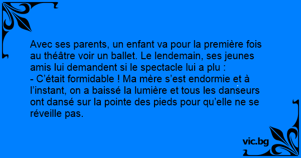 Avec ses parents, un enfant va pour la première fois au théâtre voir un ballet. Le lendemain, ses jeunes amis lui demandent si le spectacle lui a plu :