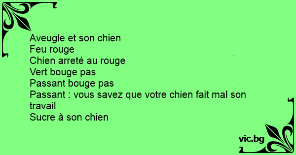 Aveugle et son chien<br />Feu rouge<br />Chien arreté au rouge<br />Vert bouge pas<br />Passant bouge pas<br />Passant : vous savez que votre chien fait mal son travail<br />Sucre à son chien