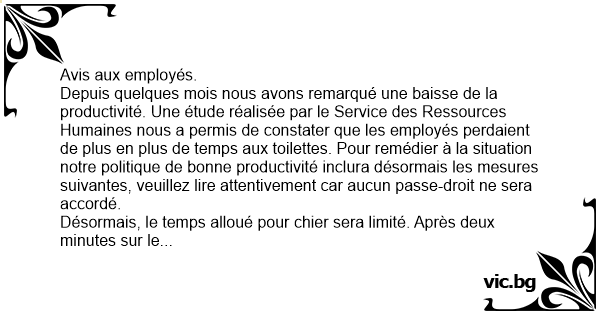 Depuis quelques mois nous avons remarqué une baisse de la productivité. Une étude réalisée par le Service des Ressources Humaines nous a permis de constater que les employés perdaient de plus en plus de temps aux toilettes. Pour remédier à la situation notre politique de воnnе productivité inclura désormais les mesures suivantes, veuillez lire attentivement car aucun passe-droit ne sera accordé.