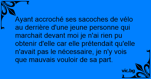 Ayant accroché ses sacoches de vélo au derrière d'une jeune personne qui marchait devant moi je n'ai rien pu obtenir d'elle car elle prétendait qu'elle n'avait pas le nécessaire, je n'y vois que mauvais vouloir de sa part.
