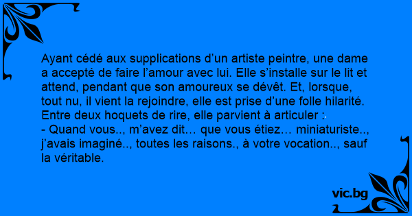 Ayant cédé aux supplications d’un artiste peintre, une dame a accepté de faire l’amour avec lui. Elle s’installe sur le lit et attend, pendant que son amoureux se dévêt. Et, lorsque, tout nu, il vient la rejoindre, elle est prise d’une folle hilarité. Entre deux hoquets de rire, elle parvient à articuler :