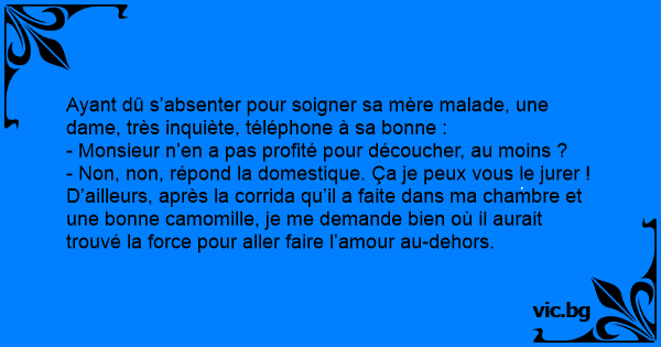 - Non, non, répond la domestique. Ça je peux vous le jurer ! D’ailleurs, après la corrida qu’il a faite dans ma chambre et une воnnе camomille, je me demande bien où il aurait trouvé la force pour aller faire l’amour au-dehors.