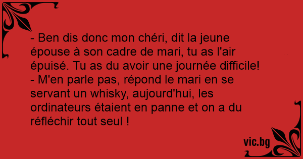 - M'en parle pas, répond le mari en se servant un whisky, aujourd'hui, les ordinateurs étaient en panne et on a du réfléchir tout seul !
