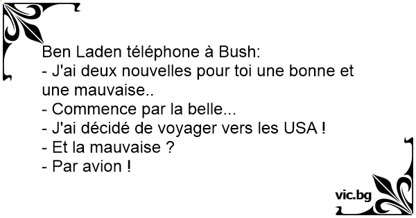 Osama Bin Laden en George W. Bush hebben een telefoongesprek. Osama zegt: "Ik heb goed en slecht nieuws, wat wil je eerst horen?" Bush antwoordt: "Het goede nieuws." "Oké," zegt Osama, "Ik geef me...