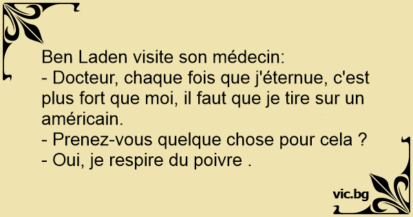 - Docteur, chaque fois que j'éternue, c'est plus fort que moi, il faut que je tire sur un américain.