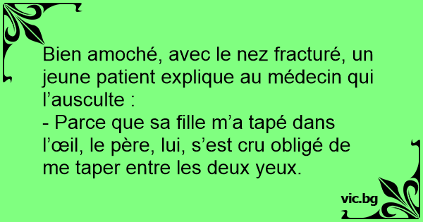 Bien amoché, avec le nez fracturé, un jeune patient explique au médecin qui l’ausculte :