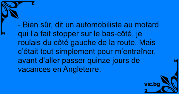 - Bien sûr, dit un automobiliste au motard qui l’a fait stopper sur le bas-côté, je roulais du côté gauche de la route. Mais c’était tout simplement pour m’entraîner, avant d’aller passer quinze jours de vacances en Angleterre.