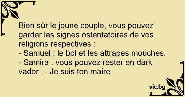 Bien sûr le jeune couple, vous pouvez garder les signes ostentatoires de vos religions respectives :