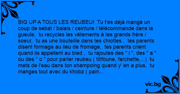 BIG UP A TOUS LES REUBEU! Tu t'es déjà mangé un coup de sebat / balais / ceinture / télécommande dans la gueule, tu recycles les vêtements à tes grands frère / soeur, tu as une bouteille dans tes chiottes , tes parents disent formage au lieu de fromage, tes parents crient quand ils appellent au bled , tu rajoutes des " i ", des " a " ou des " o " pour parler reubeu ( tilifoune, farchette,...) tu mets de l'eau dans ton shampoing quand y' en a plus, tu manges tout avec du khobz ( pain en arabe ) ! Si tu te reconnais alors vote pour cette blague !