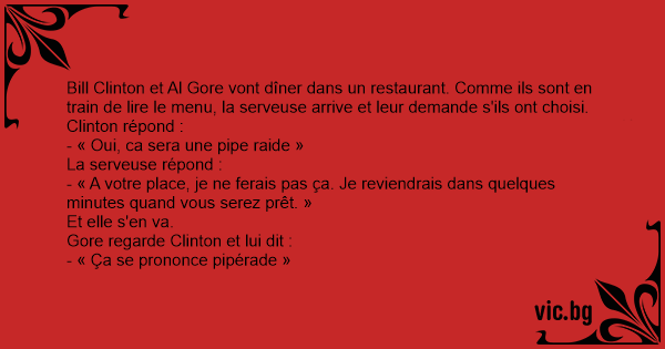 Bill Clinton et Al Gore vont dîner dans un restaurant. Comme ils sont en train de lire le menu, la serveuse arrive et leur demande s'ils ont choisi.