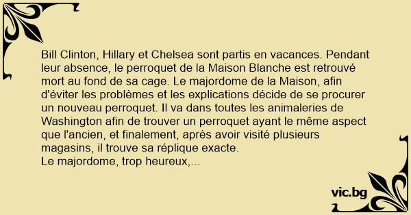 Bill Clinton, Hillary et Chelsea sont partis en vacances. Pendant leur absence, le perroquet de la Maison Blanche est retrouvé mort au fond de sa cage. Le majordome de la Maison, afin d'éviter les problèmes et les explications décide de se procurer un nouveau perroquet. Il va dans toutes les animaleries de Washington afin de trouver un perroquet ayant le même aspect que l'ancien, et finalement, après avoir visité plusieurs magasins, il trouve sa réplique exacte.