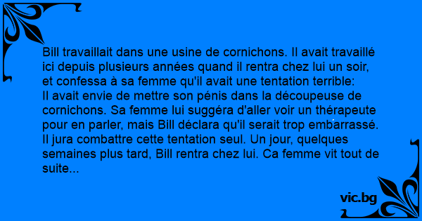 Il avait envie de mettre son pénis dans la découpeuse de cornichons. Sa femme lui suggéra d'aller voir un thérapeute pour en parler, mais Bill déclara qu'il serait trop embarrassé. Il jura combattre cette tentation seul. Un jour, quelques semaines plus таrd, Bill rentra chez lui. Ca femme vit tout de suite que quelque chose n'allait pas.