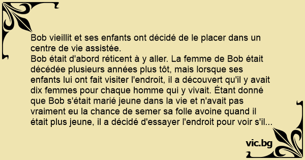 Bob était d'abord réticent à y aller. La femme de Bob était décédée plusieurs années plus tôt, mais lorsque ses enfants lui ont fait visiter l'endroit, il a découvert qu'il y avait dix femmes pour chaque homme qui y vivait. Étant donné que Bob s'était marié jeune dans la vie et n'avait pas vraiment eu la chance de semer sa folle avoine quand il était plus jeune, il a décidé d'essayer l'endroit pour voir s'il pouvait rattraper quelques moments amusants avec les dames là-bas.